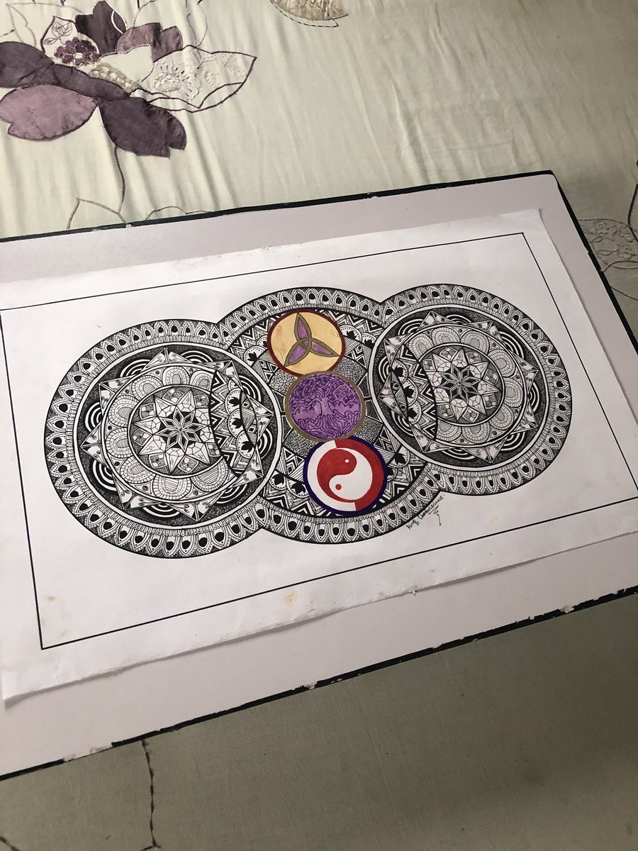Finally finished my first mandala of the year. I decided to add some colors. End result of about 11hrs work. What do y’all think?