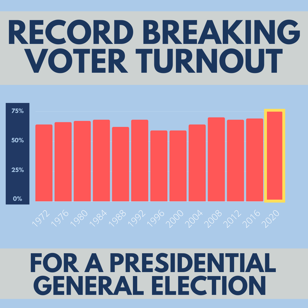 A record 5.5 million-plus voters, or 75.4% of all NC voters, cast ballots in the 2020 election. View additional voter turnout statistics here: https://go.usa.gov/x7fcf