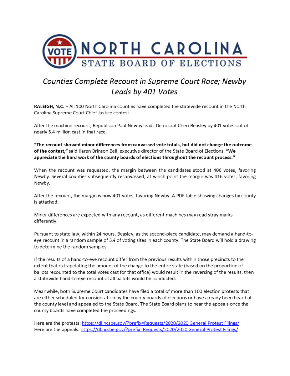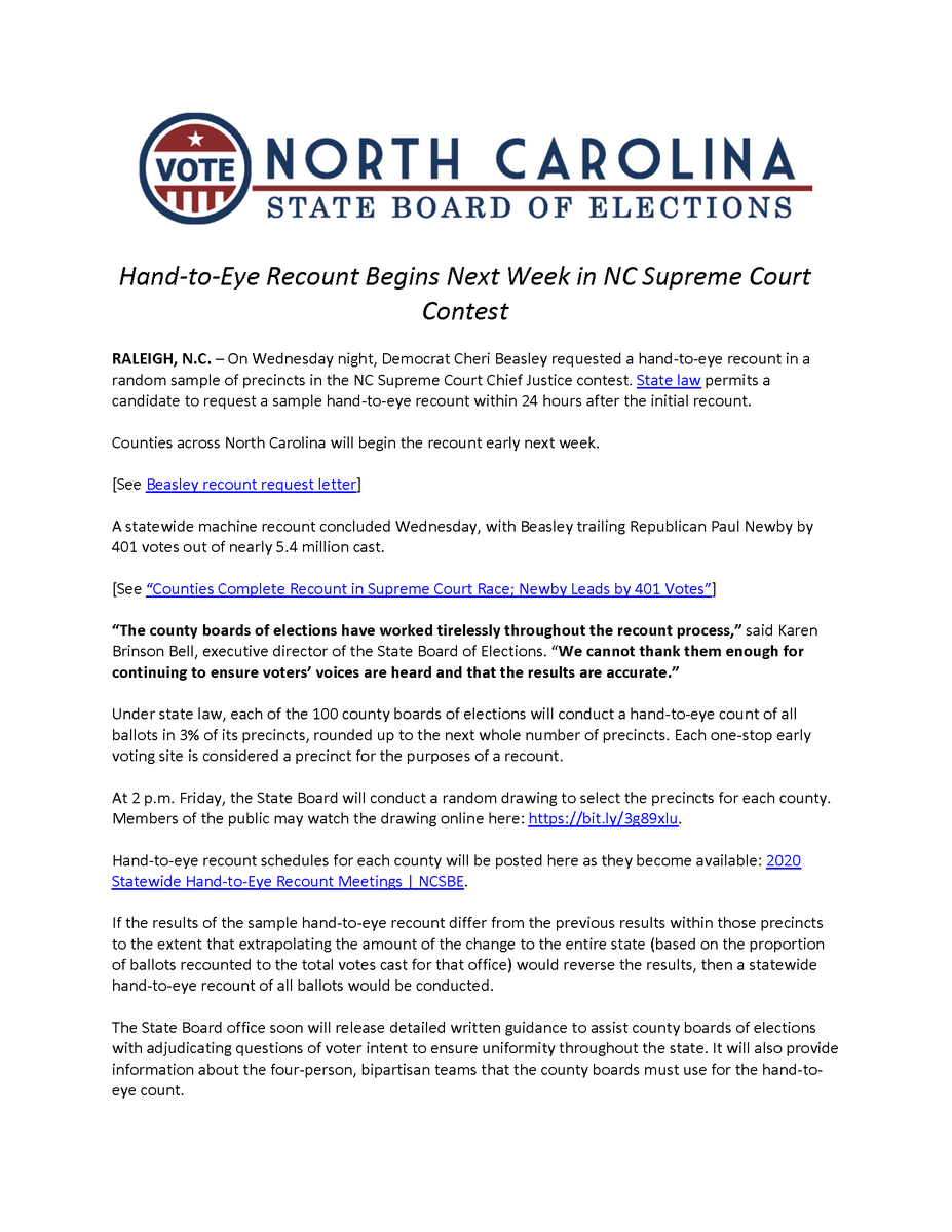 RT NCSBE "RELEASE: Hand-to-Eye Recount Begins Next Week in NC Supreme Court Contest Read online: https://bit.ly/37z1Xfv