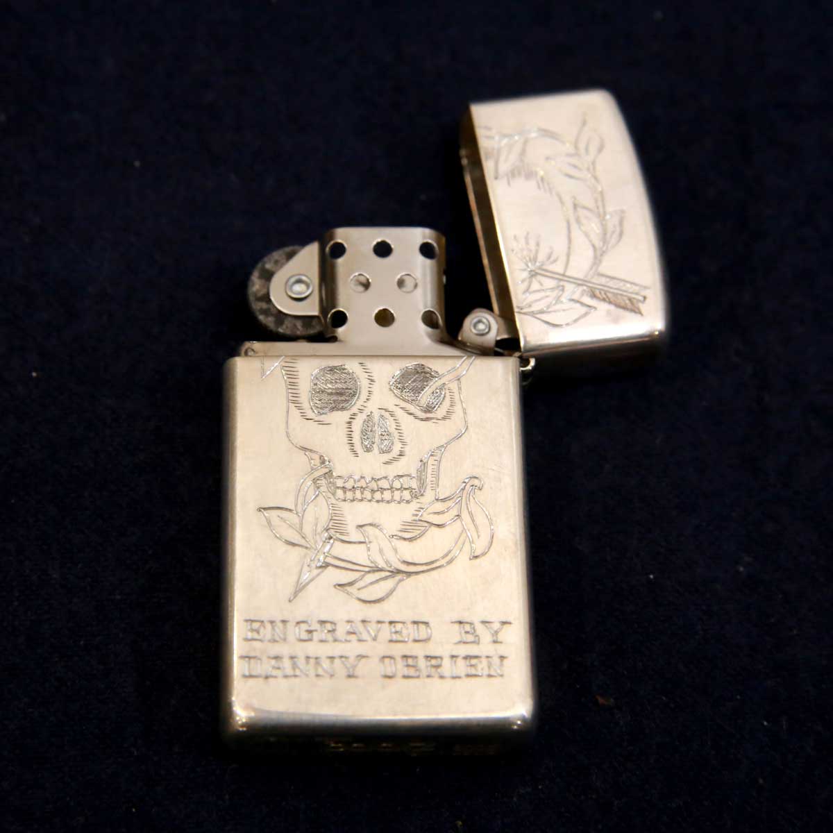 ダニー・オブライエン氏が彫金したSkull&Arrowデザインの純銀製ジッポです。 10個限定で生産されたものです。 57mmx30mmの小ぶりのジッポで,ケースが付属します。 彫金の際についたキズや、銀ならではのくすみがあります、あらかじめご了承ください。 https://is.gd/duuZsl