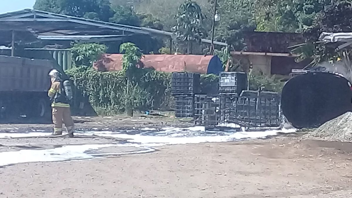 Vehículo se incendia en el Roble de Aguadulce. Las llamas alcanzan tanque con alquitrán, provocando el derrame e incendio del combustible. Bomberos de la