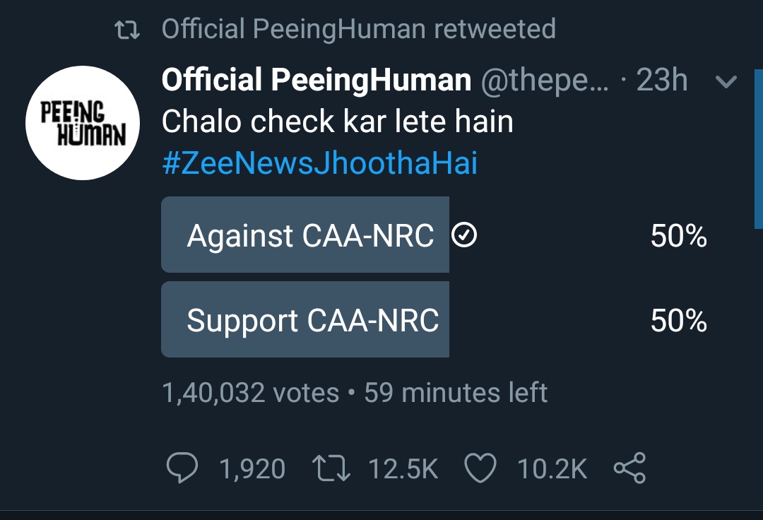 #Breaking Guys n Gals Tihari lost FB poll too by a very large margin.#IndiansAgainstCAA@sudhirchaudhary#ZeeNewsJhoothaHai pic.twitter.com/TR2cxDJlV7