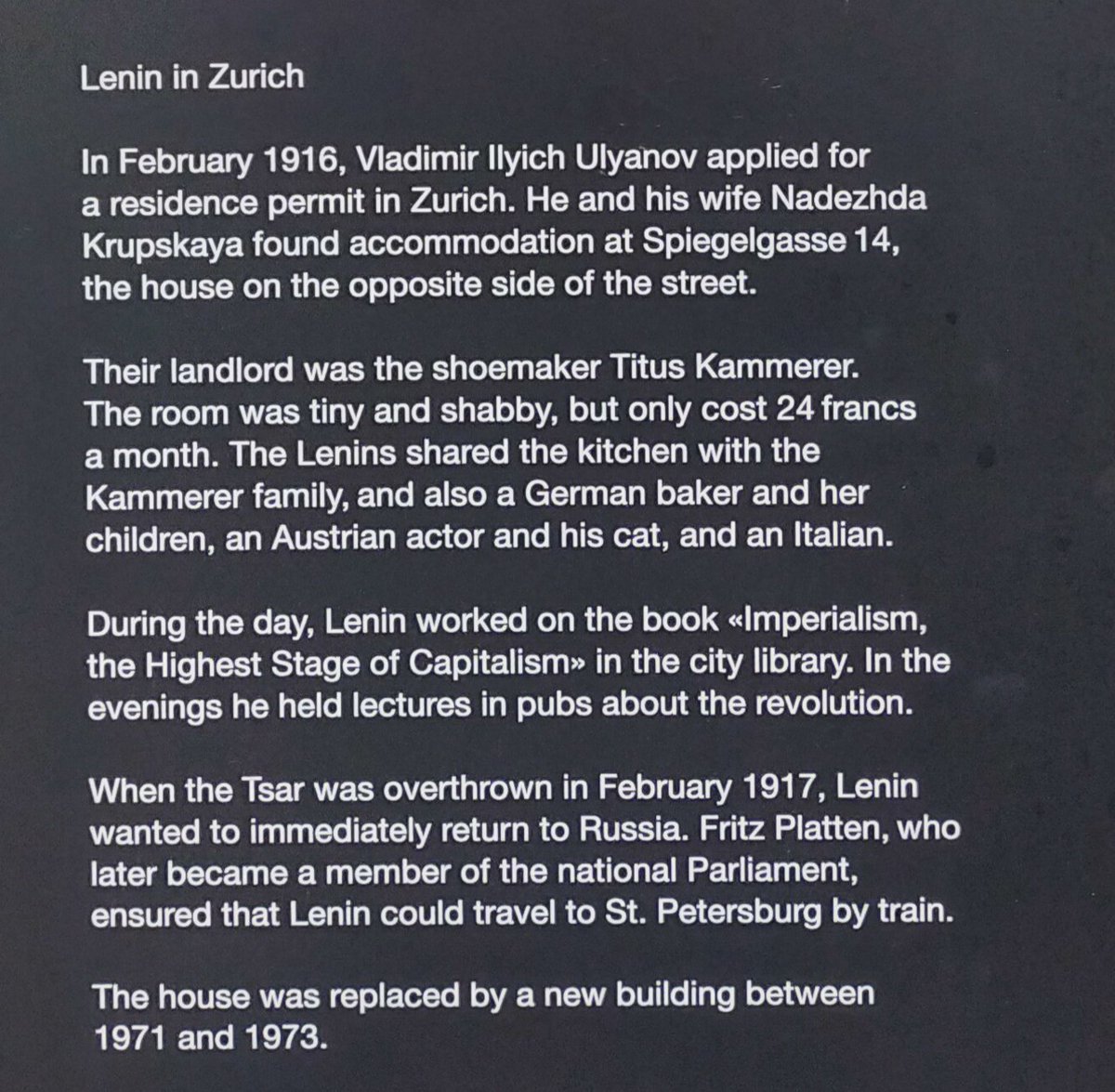#Zurich, I have to walk through Spiegelgasse 14, where Vladimir Ilyich Ulyanov#Lenin lived from Feb. 1916 to April 1917. In the city library, he worked on his book about#imperialism before he turned back to Russia to lead the Sovjet#Revolution.pic.twitter.com/ItfXekPHND