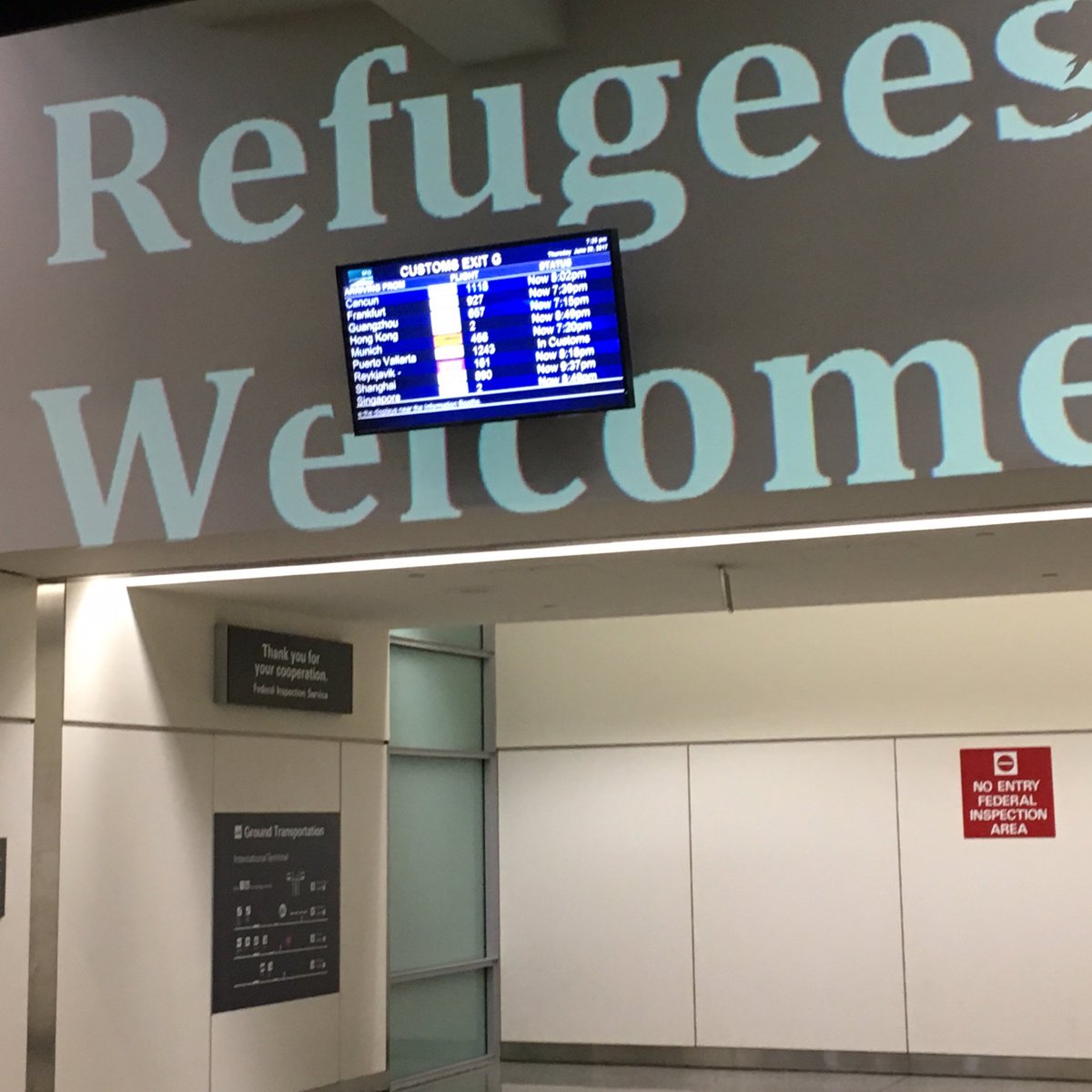 Travel ban protesters now projecting signs over U.S. Customs exit @ SFO.
