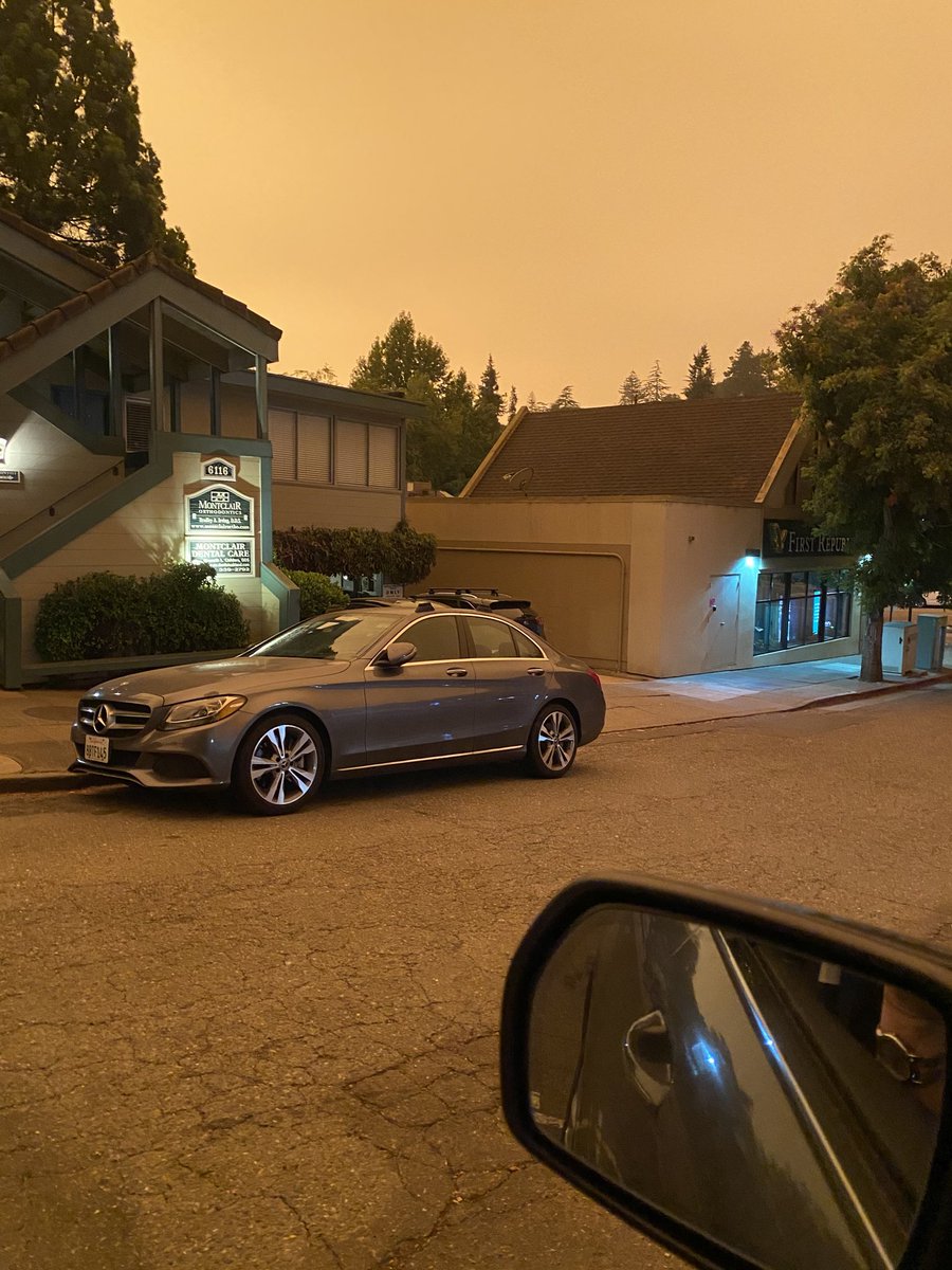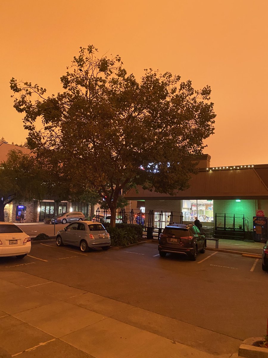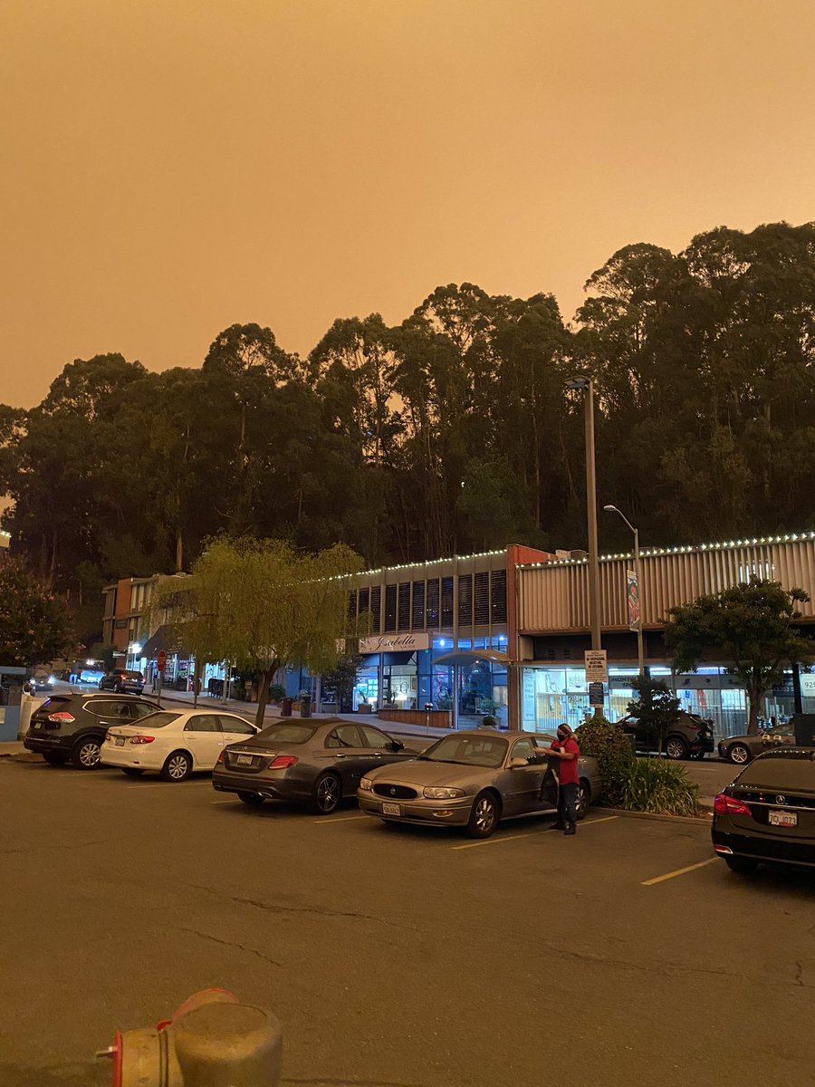 It is 9am, but It feels like nighttime in Oakland. The fires have turned the sky a dark orange.