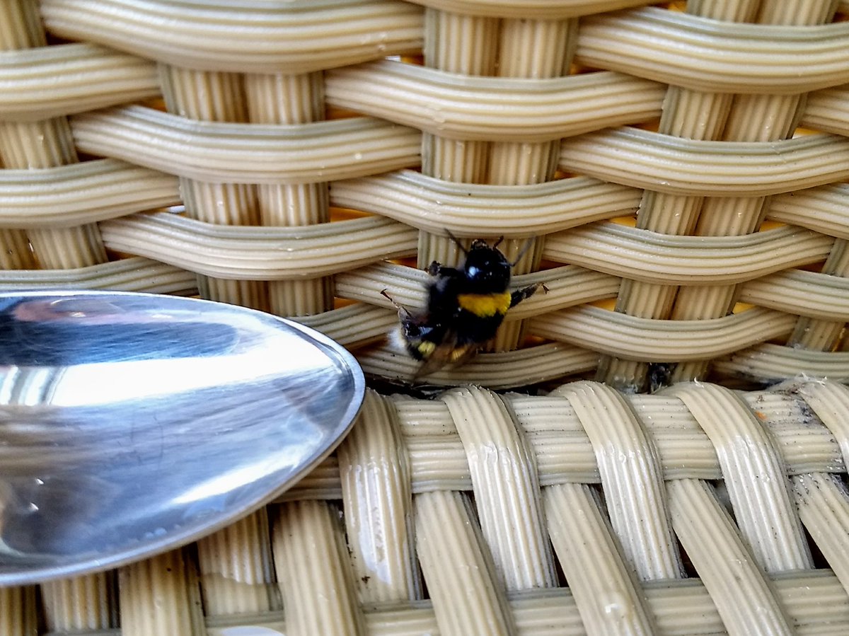 DOES THIS BEE intend to spend the night on my outdoor chair? He won't drink any water. Maybee he's just tired.