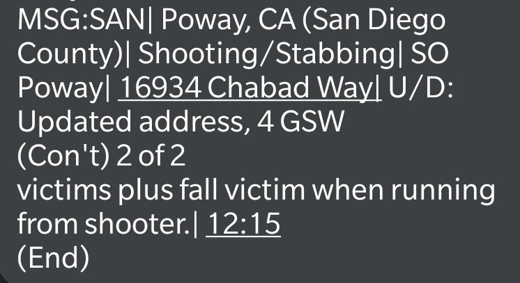 According to my wife who is near the scene of the shooting at Chabad of Poway,