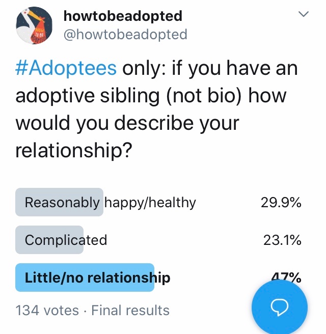 #adoptive brother or sister? Heartfelt thanks to everyone who voted in this poll. Results: 30% happy 23% complicated 47% little/no relationship#adoptee#foreverfamilypic.twitter.com/223XAU10b2