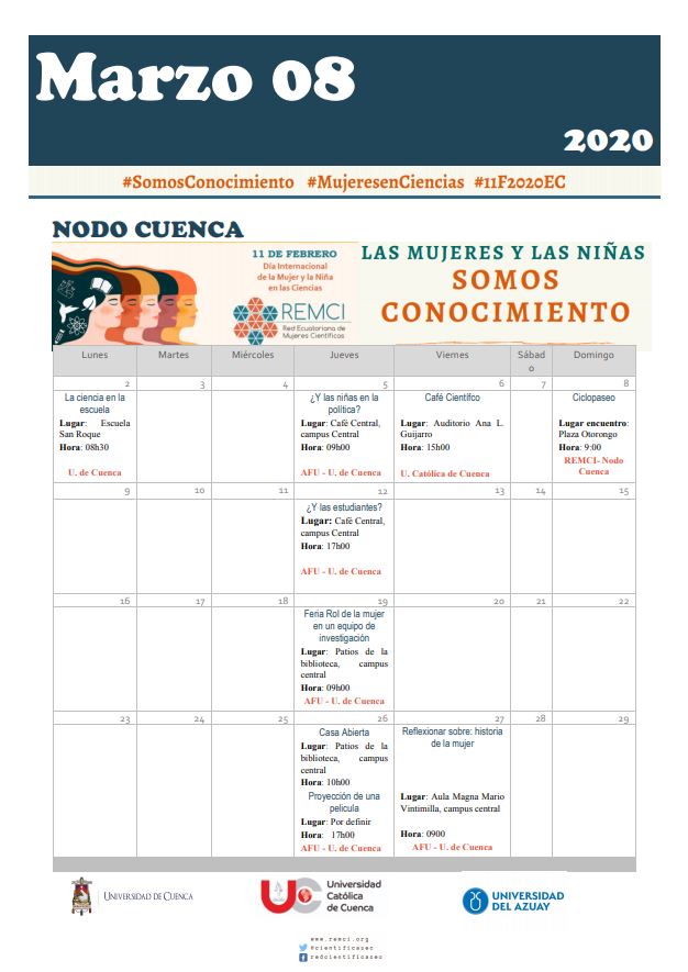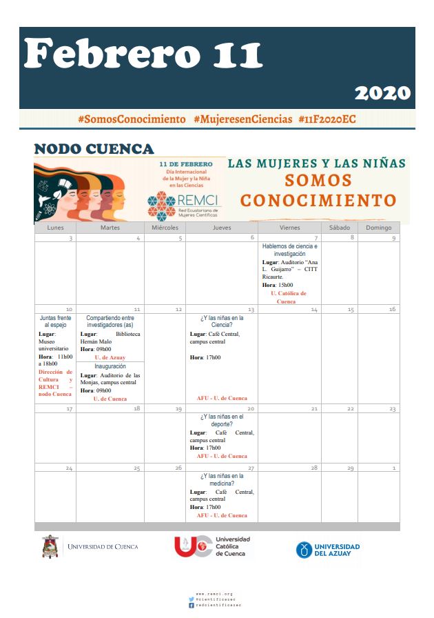 #ActividadesInvestigación#EventosUCuenca La@CientificasEC y la Asociación Femenina Universitaria#AFU de la@udecuenca, la@uazuay y la@UCatoCuenca invitamos a las diferentes actividades organizadas por el Día internacional de la Mujer y la Niña en la Ciencia. 11 de febreropic.twitter.com/9daokV5t0z