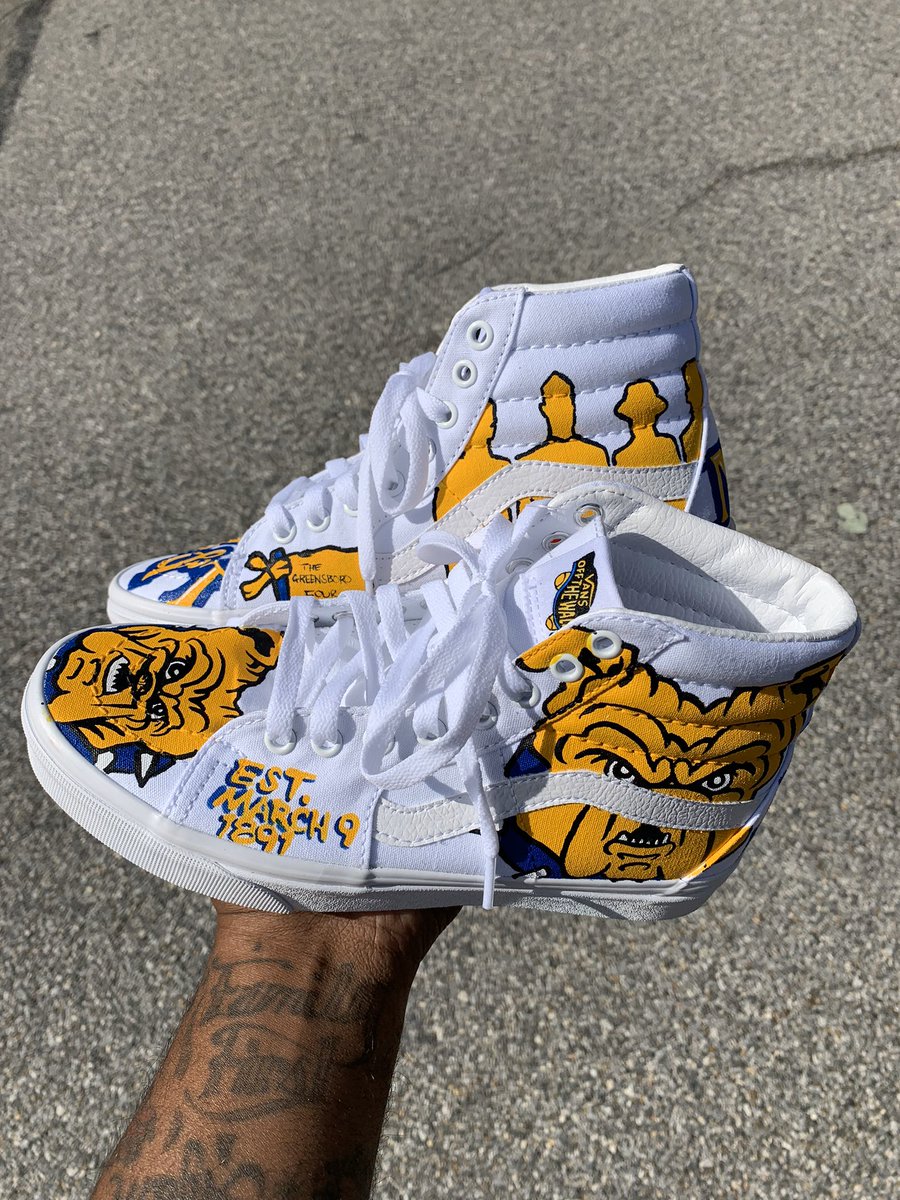#NCAT#Aggie Vans In Which We Acknowledged Astronaut#RonaldMcNair & A Collective Of Brave Gentlemen Known As The#Greensboro4#Vans#VansSk8Hi#Aggies#Greensboro#HBCU#AggiesAllTheWay#HandPainted#CustomShoes#HandCraftedpic.twitter.com/pGTXS6OlJa