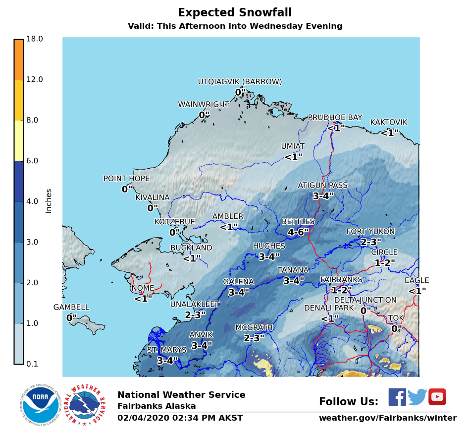 Snow will continue across most of Northern Alaska this afternoon into Wednesday evening, here is a look at the expected snowfall amounts.