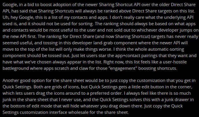 @Android, read@RonAmadeo's review of the share menu in#Android10. I don't get the obsession with#algorithmic anticipation. Just give users control instead. It's easier and just as (or more) effective.#Humans can do#personalization plenty fine! https://arstechnica.com/gadgets/2019/09/android-10-the-ars-technica-review/#h26 …pic.twitter.com/aOiY3lmRVD