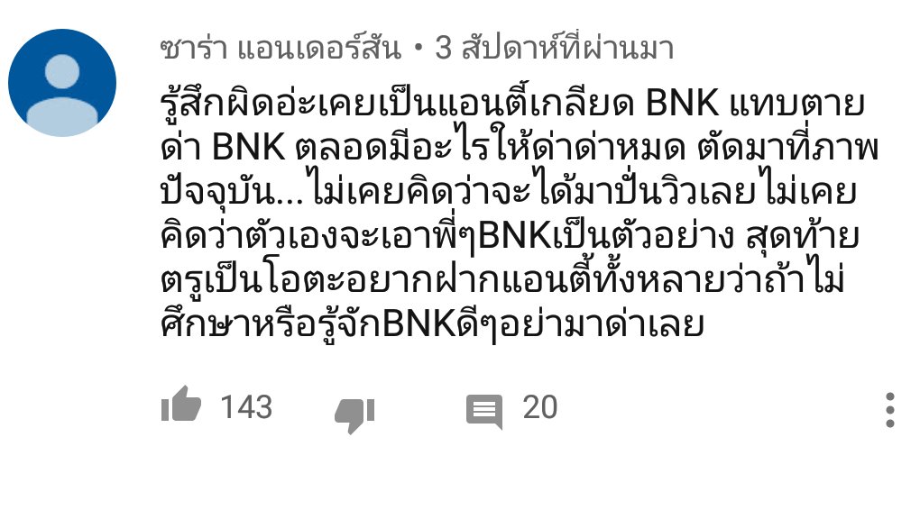 เเอนตี้ของ จนค ดูมีสมองมากกว่า เเอนตี้ BNK48 พอโอตะซวนกลับ ก็เเถไปอย่างหน้าด้านๆ พอสู้ไม่ไหว ก็เรียกพวกมา ถถถถถถ พวกขี้เเพ้เอ้ยยย