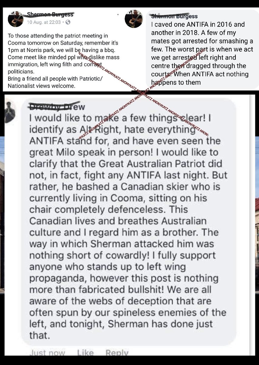 #Cooma kitizenz Shermon Burgess is holding a BBQ today at Norris Park in Cooma NSW. In the FB post promoting it he's bragging about beating up on#ANTIFA - so take care if you're attending. Bottom image relates to the 2018 incident. pic.twitter.com/qhKm2V0Xiw