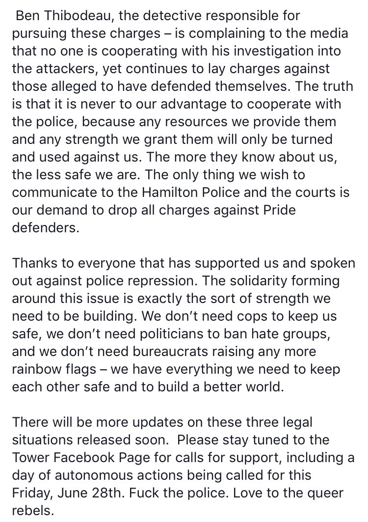 @HamiltonPolice for their disgraceful inaction at@HamiltonPride or their continued harassment of the#LGBTQ defenders and#antifascists who protected Pride-goers.#FreeCedarhttps://twitter.com/atlanticpolisci/status/1143970317985099776 …