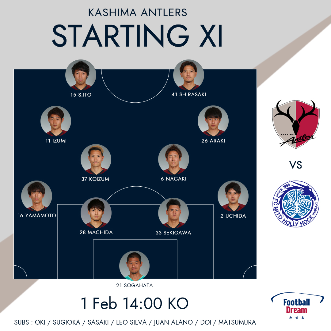 #antlers#kashima スタメン: GK 曽ケ端準 DF 内田篤人 関川郁万 町田浩樹 山本脩斗 MF 永木亮太 小泉慶 荒木遼太郎 和泉竜司 FW 白崎凌兵 伊藤翔 サブ: GK 沖悠哉 DF 杉岡大暉 佐々木翔悟 MF レオシルバ ファンアラーノ 土居聖真 松村優太 詳細 https://bit.ly/36RzJdT pic.twitter.com/k7EktRwqwZ