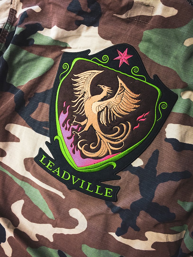 A big and bold embroidered back patch on a camo jacket for http://leadvillebelts.com . Collaboration with http://www.mytprint.com in Beaverton.
