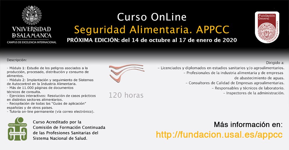 #CursoOnline#SeguridadAlimentaria#APPCC Comienzo el 14 de octubre. 120 horas. Duración: 14 semanas. Todavía puedes matricularte! Más información en http://fundacion.usal.es/appcc#FormaciónOnLinepic.twitter.com/RpzWJjLhGv