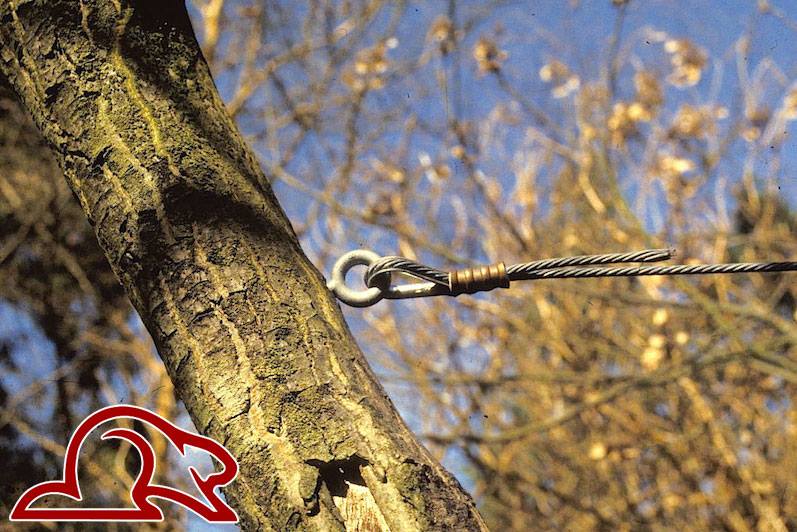 Sometimes trees develop in a way which makes them structurally weak making them susceptible to damage from winds, storms or even the weight of their own foliage. In established trees, cables and braces are used to prevent or reduce storm damage.
