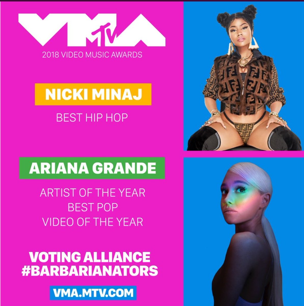 #Arianators and#Barbz, let's vote for Nicki and Ariana in these categories at#VMA! Ariana Grande: •Artist Of The Year •Best Pop (NTLTC) •Video Of The Year (NTLTC) Nicki Minaj: Best Hip Hop (Chun-Li) http://www.mtv.com/vma/vote/#BarbArianators#ArianaGrande#NickiMinaj#VMAspic.twitter.com/Jtyp5gQVv8