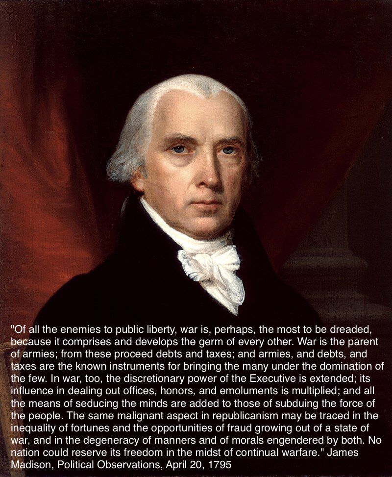 #PublicLiberty,#War is the most dreaded, it comprises & develops the germ of every other. Parent of#Armies,#Debt &#Taxes - instruments for bringing the many under the domination of the few; no nation may reserve#Freedom in the midst of#ContinualWarfare.pic.twitter.com/YmF3Bvn4Hm
