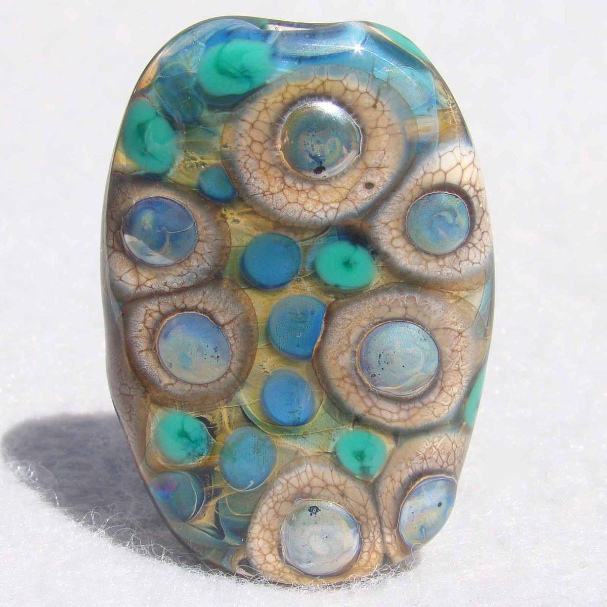 HYDE PARK Handmade Art Glass Focal Bead Flaming Fools Focal bead featuring assorted silvered-glasses, in soft shades of blue, green, and gold, finished with dark-ivory and metallic glass studs. https://www.ebay.com/itm/372369173598 …