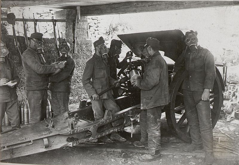 7 September 1917 - 101 years ago today: Gas mask wearing Austro-Hungarian artillerymen operate a 15 cm schwere Feldhaubitze (Heavy Field Howitzer) M.14 on the Karst/Carso on the Isonzo Front.