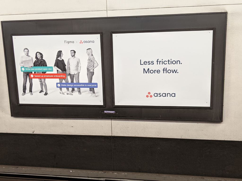 Station domination. Ads are clean, consistent, legible, pretty. Wondering though, should there be a line of copy explaining what Asana is? Guessing the actual audience is quite narrow, so that group knows already?