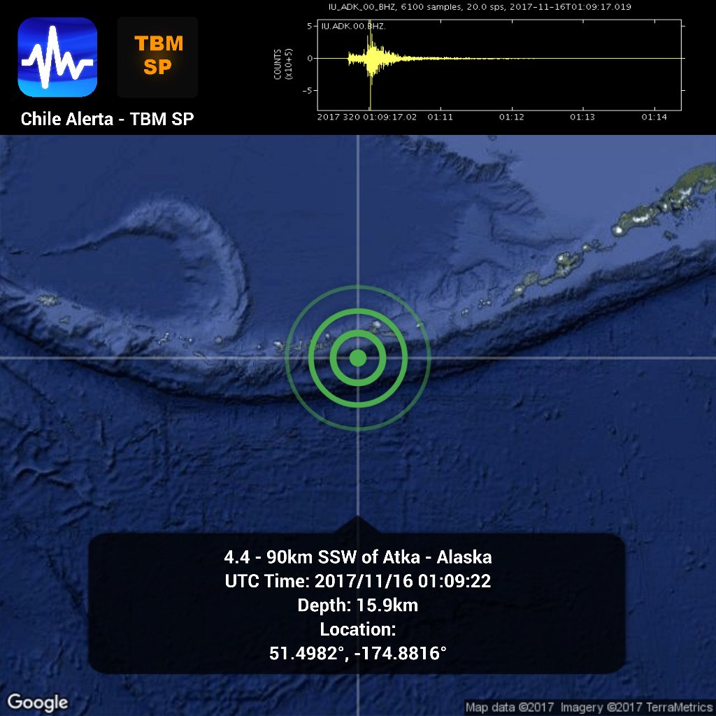4.4 - 90km SSW of #Atka -#Alaska. 2017/11/16 01:09:22.#Temblor#Sismo#USGS#alertpic.twitter.com/j9w6778XBb