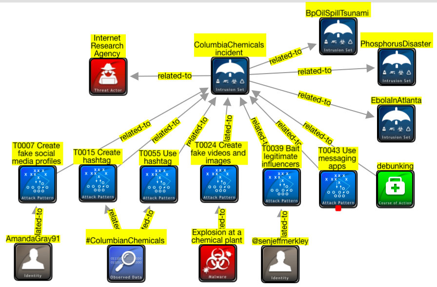#attackcon talk: first image of a misinformation incident in STIG. It's not perfect, What this means is that we can now create graph views of misinformation campaigns and store them in STIX format ready for further processing. pic.twitter.com/q5oVFQSrLq