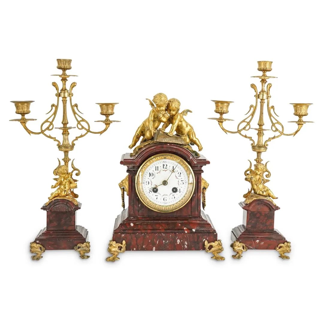 #French Empire#style Rouge Marble Garniture Set (3 pieces). A marble garniture set including a mantle clock and two matching candelabras.#Clock#Marble#auctions#AuctionUpdate#AuctionResult#AuctionNews https://bit.ly/32hq2J8 pic.twitter.com/ENnMnjIrhr