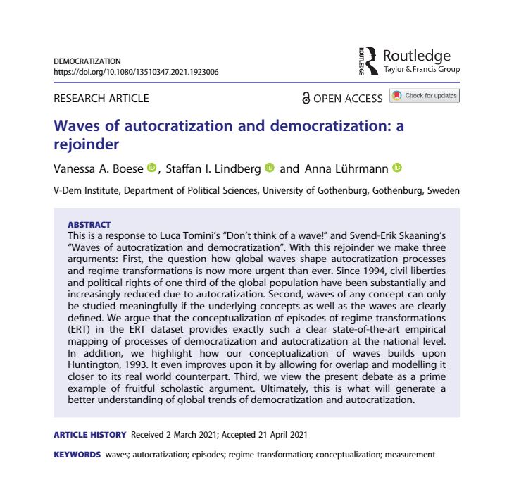 @BoeseVanessa@StaffanILindber and@AnnaLuehrmann to recent debates in@democ_journal about waves of#autocratization and#democratization. Replying to articles by Svend-Erik Skaaning and@LucaTomini. https://www.tandfonline.com/doi/full/10.1080/13510347.2021.1923006?src=#.YKsflwZ3PBk.twitter …pic.twitter.com/QNzFqR4XPI