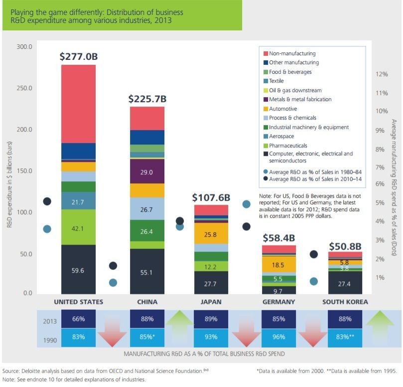 Nations have different research approaches: While the United States & China are placing large and diversified bets, Japan, Germany, and South Korea are taking a more focused approach.