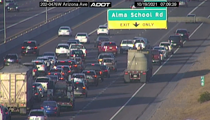 Traffic Alert: Loop 202 (Santan) WB approaching Alma School, crash blocking right lanes.