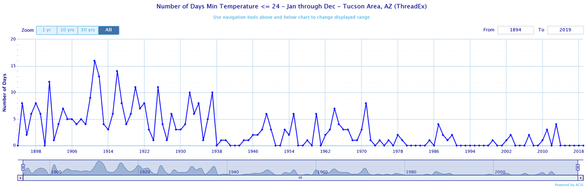 Low so far this morning at the Tucson Intl airport has been 24°. Coldest low temperature since January 2013. Here is a yearly occurrence time series of low temperatures that were 24° or colder since 1895.