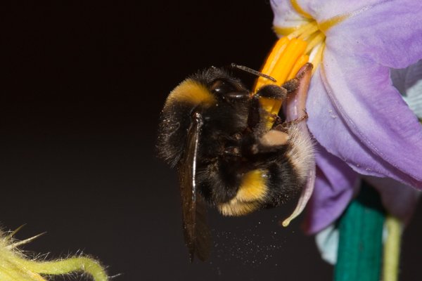 Bumble bee on passion flower with pollen grains stuck by static to her hairs
