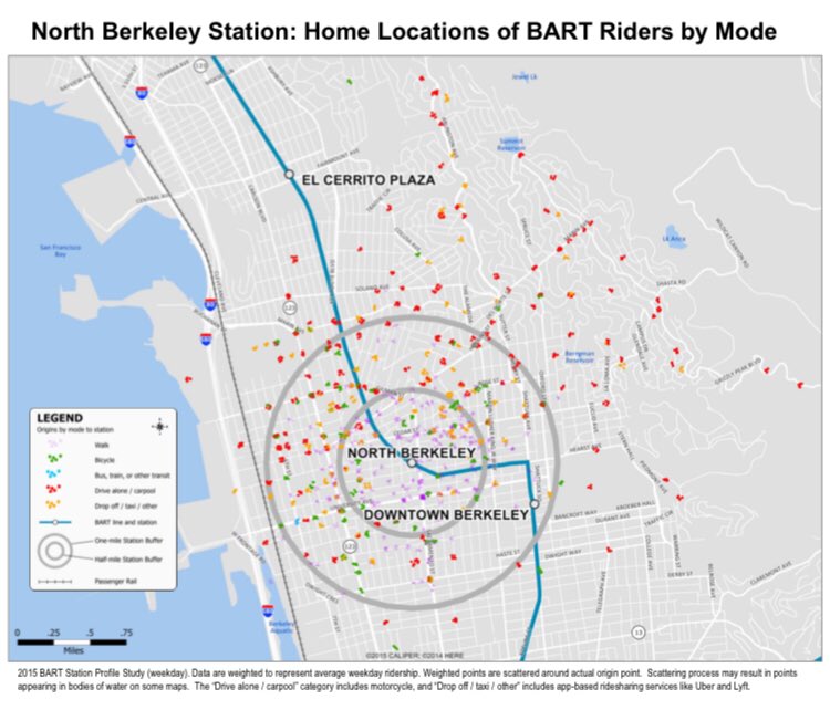 BART’s last station profile study was 2015 but at that time only 25% of N Berkeley riders were traveling there from home by driving themselves, and many of them for less than one mile. With only 1% arriving by bus/transit there’s huge potential for mode shift.
