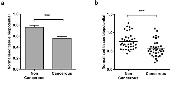 The electrical potential of cancerous tissue is lower compared to non-cancerous tissues -> https://www.nature.com/articles/s41598-018-32720-8 …