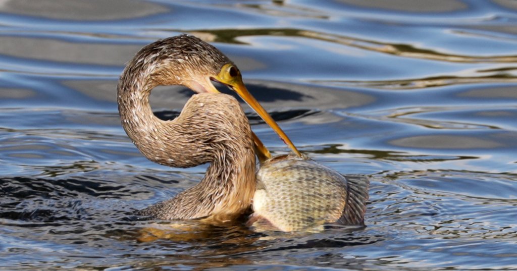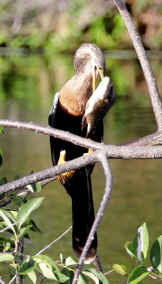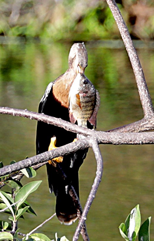 The one that got away. This Anhinga struggled with this large fish for 2 or 3 minutes. In a tree, then back to the water, then under the water and back up. Finally the fish escaped.