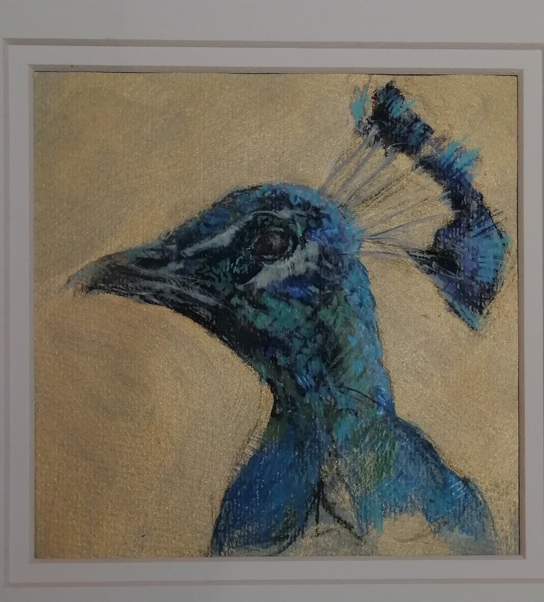 Finished - with a gold background to enhance the beautiful colours of a peacock .. mixed media (basically everything chucked at it) on a grey ingres artist paper (amazingly it survived my treatment). I've also varnished the cockerel ready for framing (gulp!)