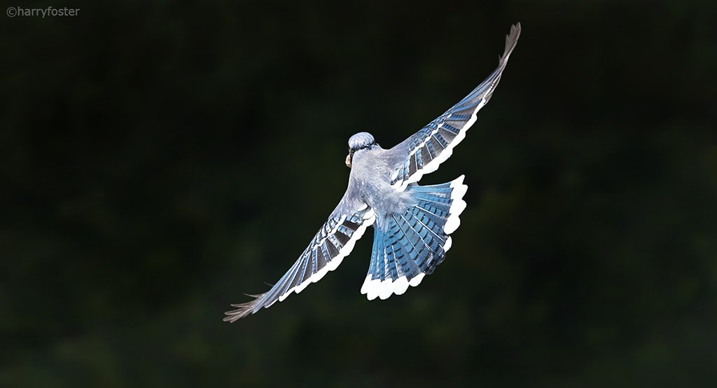 My Blue Jay shot of the day. This Jay gliding in through the sunlight with all flaps set for a good landing....right in the peanut pile.