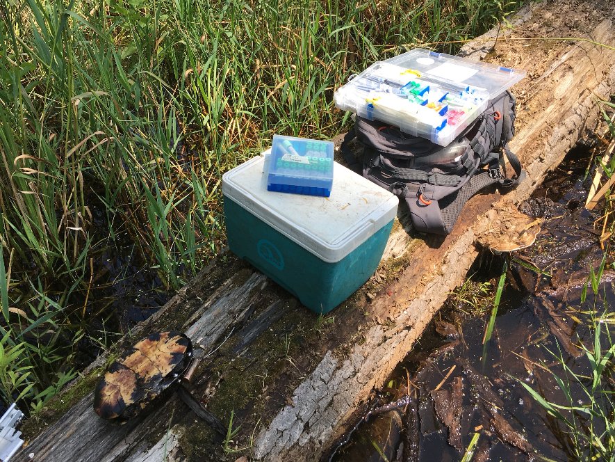 Here's what a typical blanding's field work set-up looks like! You never know where you might find a turtle and have to collect samples. Sometimes you're on a partially submerged log, while others in a mosquito-filled forest.