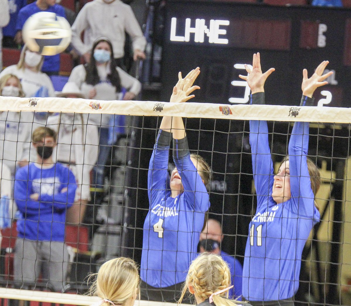 @KileyRathjen of@CentennialVB18 go for a block against LHNE in the first round of state volleyball.#broncoblue#blockparty pic.twitter.com/jwCIdIewY8