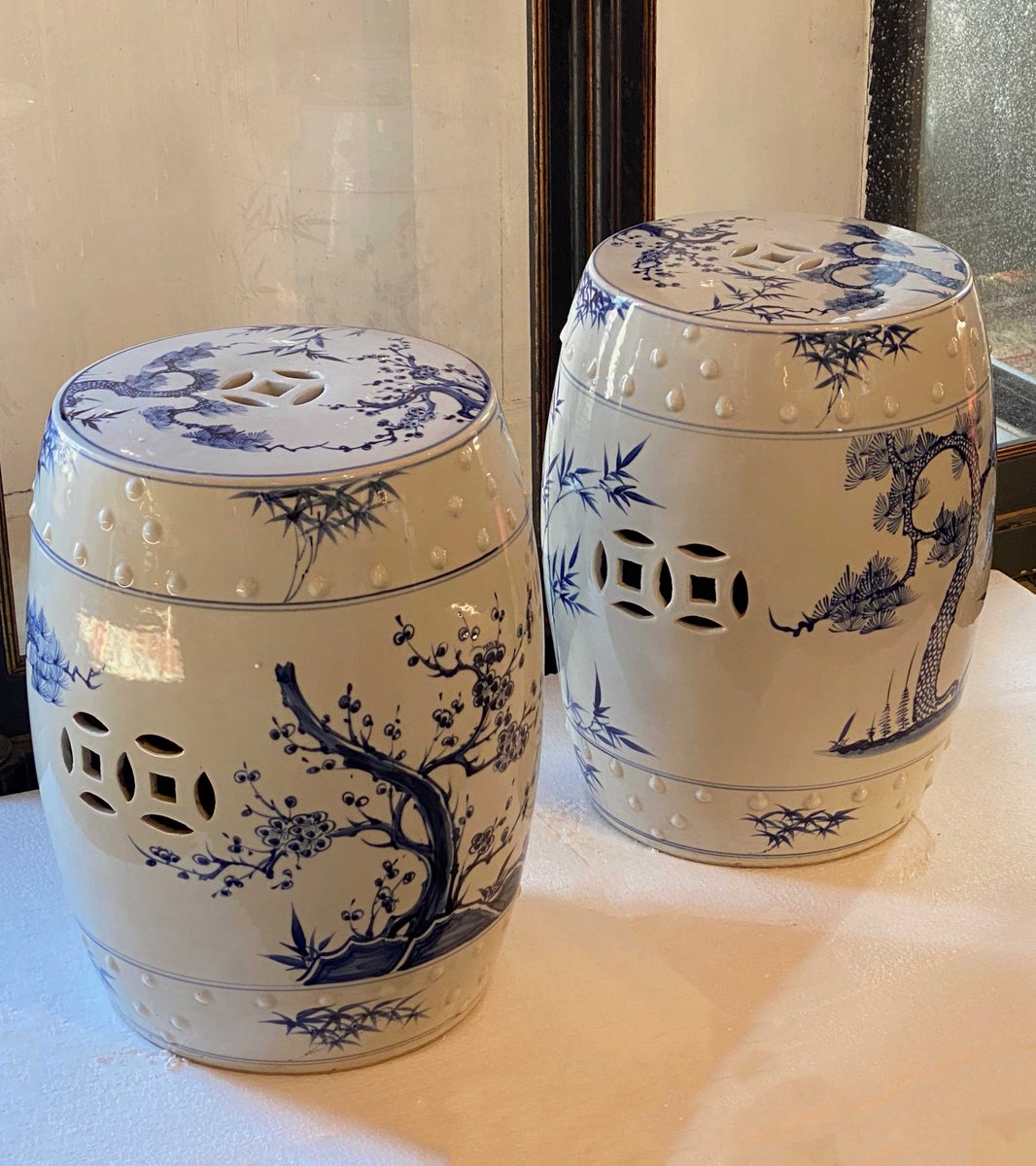Blue and White Garden Seats - A Pair 19” High x 13” Diameter $695 Bella French Antiques Dealer #23 Antique Row, Dallas 5013 W Lovers Lane Dallas, TX 75209