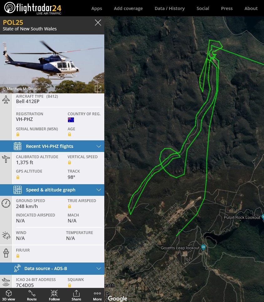 Polair having a look around Hanging Rock & the track up to it. >40° out there, anyone bushwalking today is asking for trouble.