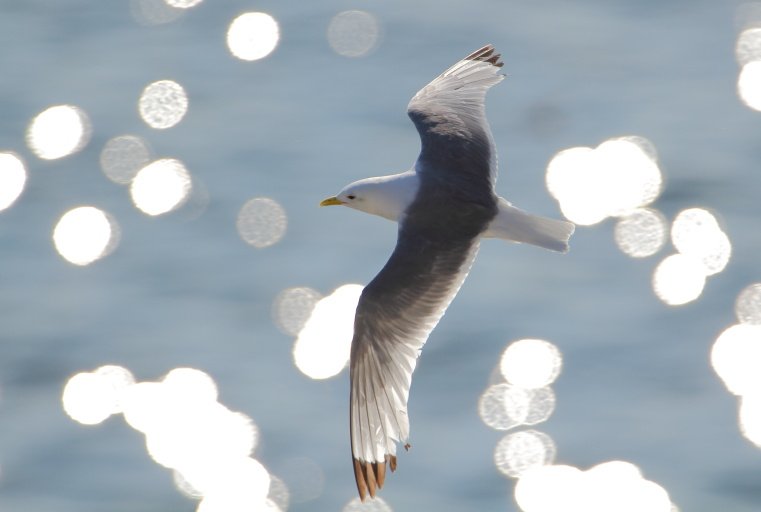 Seabirds with sparkle. Gannets and a Kittiwake in flight around the cliffs at