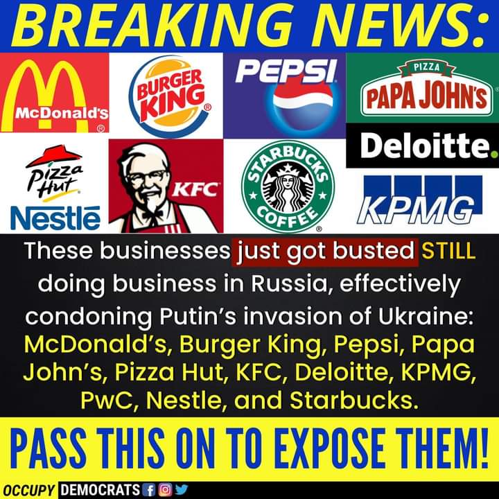 @pepsi@kfc@tacobell@Deloitte@JNJNews@krispykreme@McDonalds@BurgerKing@PapaJohns@PwC@KPMG@dominos@pizzahut@Starbucks@Nestle Get out of Russia or we#boycott .@CocaCola we need a official announcement also.#ukrainepic.twitter.com/p2umYy7Smo