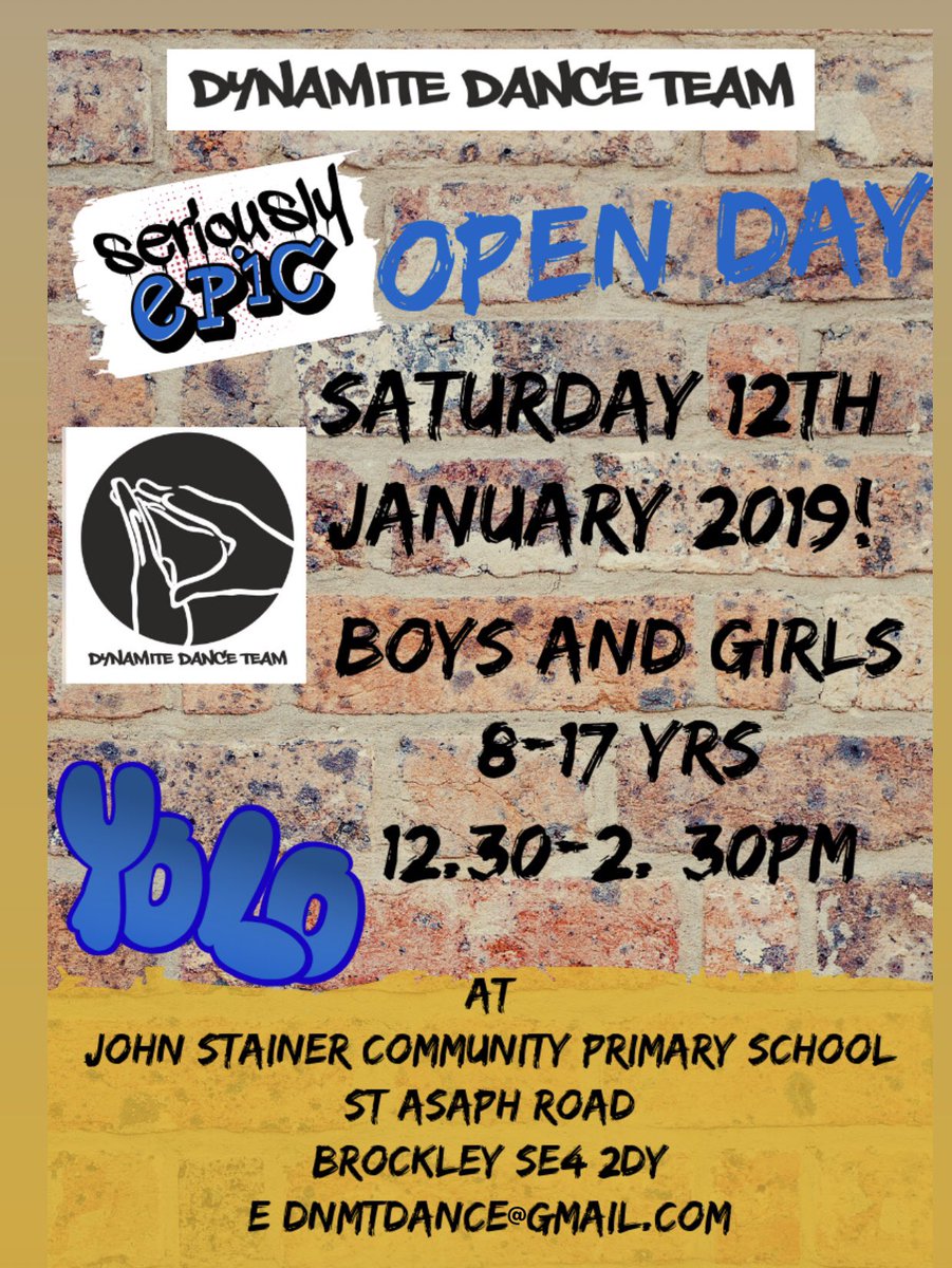 #recruiting!!!!#Boys and#girls ages 8-17, Come along to the#dynamitedanceteam#open day, starting next week Saturday- the 12th of#January until the 2nd of#February#brockley#se4#johnstainerprimaryschoolpic.twitter.com/g5qmzQryva