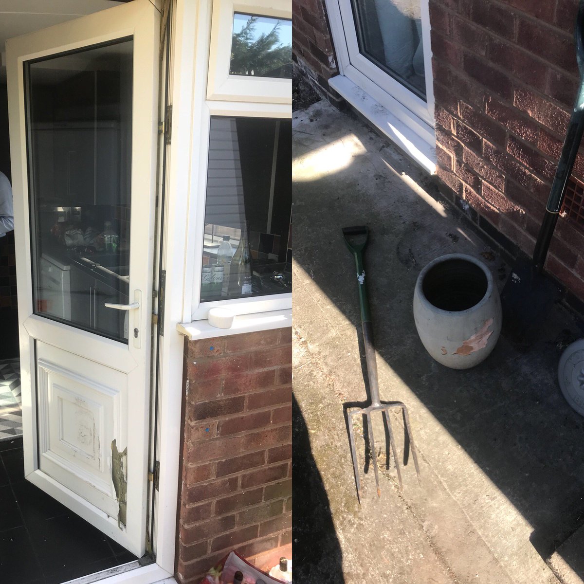 brutal....door broken off it’s hinges using a spade and fork left in the garden. THINK! That lovely plant pot or garden tool left in the garden! MOVE it!It could be used to break into your house! Unfortunately its the world we live in!
