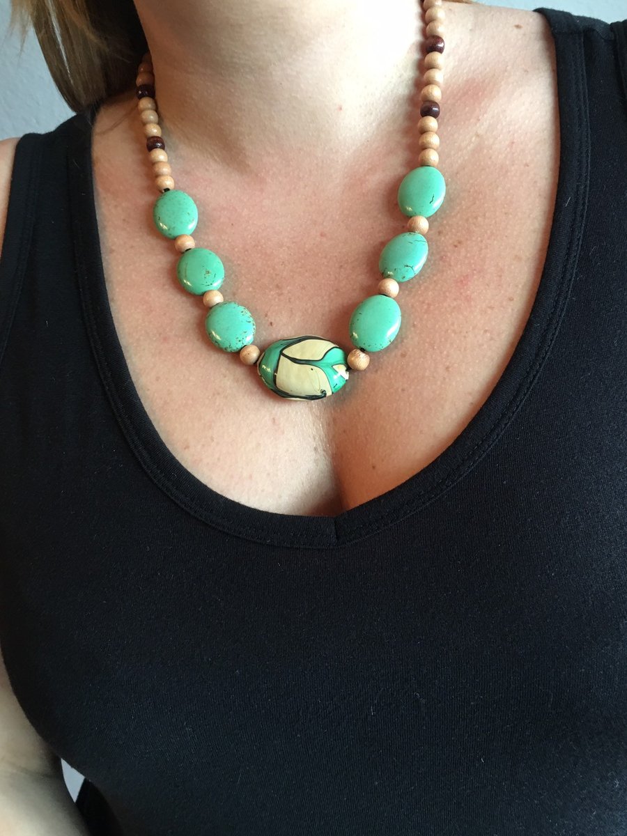 Chunky Boho Necklace, Green Turquoise Magnesite stone, large Porcelain pendant, art nouveau, wood, hippie, statement necklace, ceramic beads http://tuppu.net/e48b1ba7